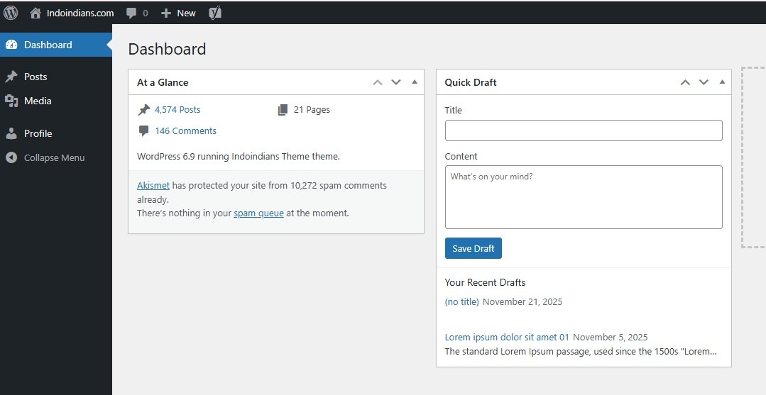 After logging into your Author account on indoindians.com, you will land on the main Admin page called the Dashboard, which provides features to manage your content.