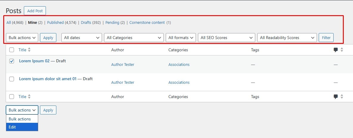 - All formats, All SEO Scores, All Readability Scores → Used to filter by format, SEO score, or readability score (depending on the plugins used).