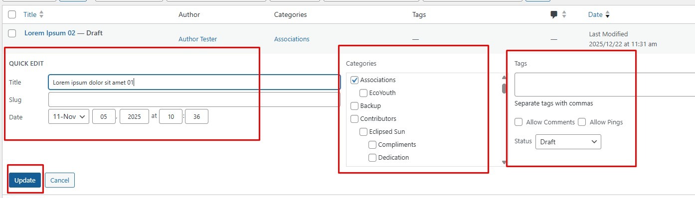 Title, slug, date, category, tags, and status (Draft / Pending Review). - Click Update to save.