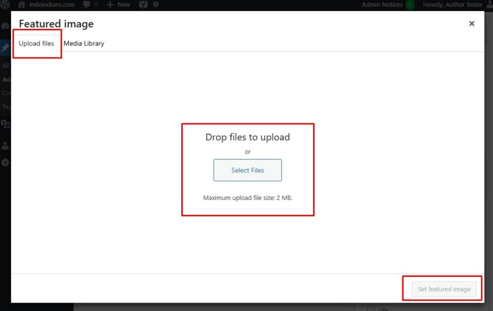 - You can upload a new image file from your computer by clicking “Upload files → Select Files”, choose the file to upload, then click the “Set featured image” button.